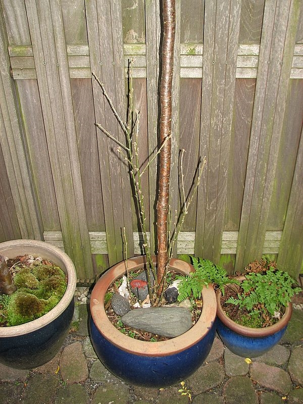 Heute morgen war es trocken und ich habe die fehlende Aufnahme gemacht - im Ausgangsbeitrag gibt es nun auch ein Bild vom Topf mit der Probepflanze und dem aufgepfropften Goldregen.