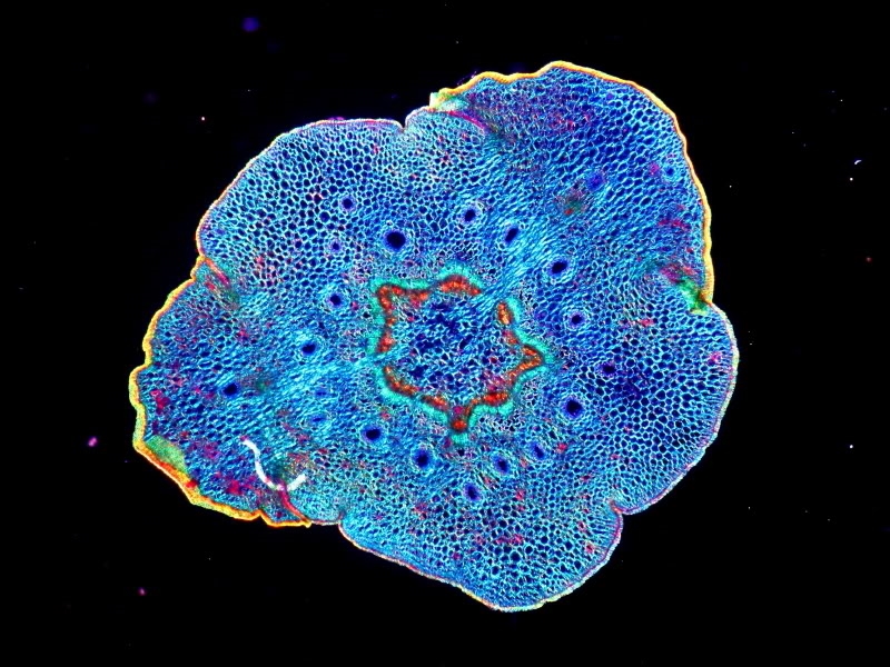 Zu deinem wunderbaren Spross-Schnitt eine Ergänzung von mir: ein Schnitt durch die Spross-Spitze, die noch keine Lignifizierung aufweist. Auf 1h und ca 8h sieht man 2 Blätter, die auf deinem Eingangsbild unscheinbare braune Dreiecke sind. Die vielen Harzkanäle gehören zu den in der Spross-Spitze angelegten Nadeln, die da noch eng zusammengedrängt liegen und sich erst bei weiterem Wachstum zum "Schirmchen" entfalten.