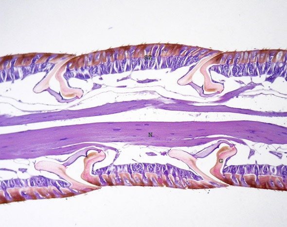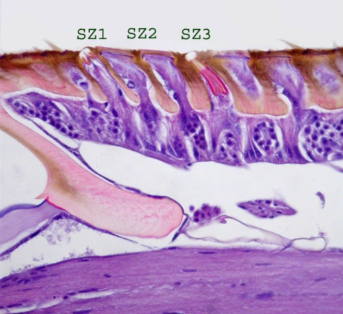 Hier sind ein paar verschiedenartige Sinneszellen SZ 1-3 zu sehen. Nur: der genauen Aufbau der Sinneszellen lässt sich mit diesem Schnitt nicht ermitteln. Auch fehlen die Verbindungen zum mittigen Hauptnerv. Ein paar neue Wespen müssen her!