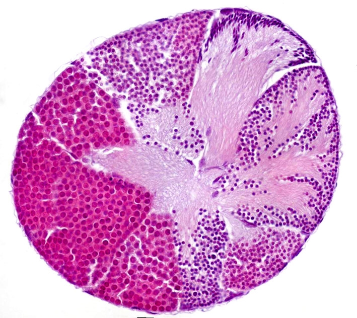 Ich wurde sagen das es Gehirngewebe ist mit hier und da einige Neuronen Perikarya und viele Neuronen am Rand.