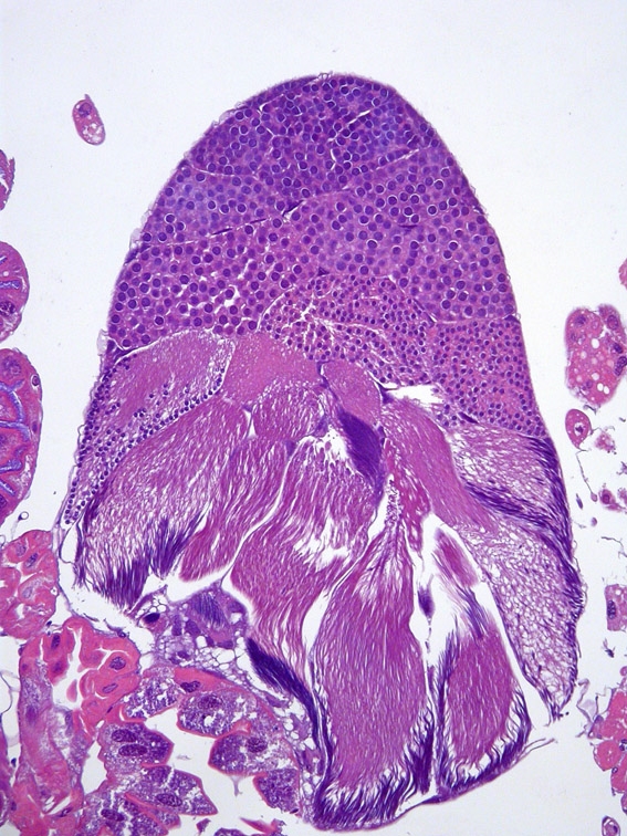 die beiden ersten Bilder zeigen sicher die Hoden. Das erste ist ein ungefährer Querschnitt durch den Hoden etwa in halber Höhe des im zweiten Bild gezeigten Längsschnittes.  Das feine weißliche Gefussel sind die Geißeln der Spermien, im ersten Bild bei 13 Uhr stammen sie von den fast fertig ausgebildeten Spermien, im zweiten Bild befinden sich die reifen Spermien am unteren Teil des Hodens. Warum keine Teilungsfiguren zu sehen sind frage ich mich auch. Es könnte sein, dass die Teilungen synchron zu bestimmten Tageszeiten stattfinden.