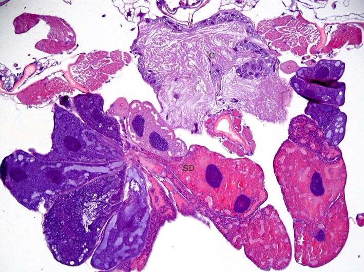 Oder dieser überprozessierte Schnitt hier: Er zeigt in der unteren Hälfte die Speicheldrüse der Zikade SD oben ist ein Ganglienknoten G? Aber wie genau gestaltet sich diese Drüse? Wo sind die Ausgänge? Warum färbt sie sich einmal rot einmal blau? Fehlerhafter Färbeprozess oder verschiedene Speichelarten? Verschiedene Entwicklungsstadien? Was sind das für regelmäßige tiefblaue Flecken mittig in den Drüsenlappen? Auch hier: Warten bis zum nächsten Sommer....