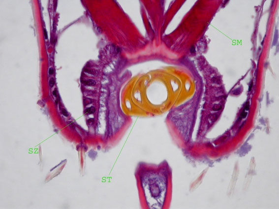 Man kann noch sehr gut den Aufbau des Stachels ST erkennen, der aus vier Teilen besteht, die ineinander verhakt sind, ähnlich dem Legestachel des gleichen Tiers. In der mittigen Öffnung wird der Pflanzensaft angesaugt. Ich vermute, dass in den seitlichen Öffnungen das Speichelsekret in das Bohrlöchelchen der Pflanze fließt, mit dem das Tier eine Art gallertartige Scheide um den Stachel innerhalb der Pflanze bilden kann. (Auf dass nur ja kein Pflanzensaft daneben fließt) Aber wie findet die Zikade eigentlich das Xylem das sie anbohrt? Nach der Literatur zu urteilen, kann sie mit dem Stachel auch kurvig in das Pflanzenblatt hineinstechen. Die Muskulatur SM könnte den Stachel bewegen. Und sind SZ etwa Sinneszellen, die dem Tier eine Rückkopplung zu den Bewegungen des Stachels liefern? Sind das Abrisse der SZ zum darum liegenden Integument? Fragen über Fragen....