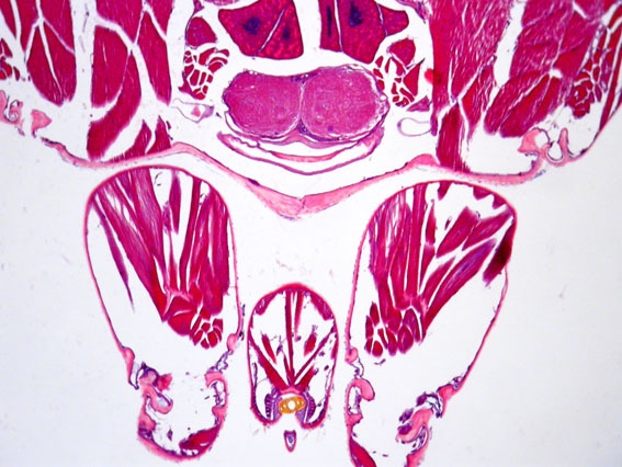 Hier ein Längsschnitt. Aber wo ist der Samenleiter? Wie geht es vom Hoden weiter? Bei beiden Präparationen missrieten die folgenden Schnitte aus verschiedenen Gründen. Auch wäre zu klären, wann den eigentlich die Teilungsprozesse stattfinden. In beiden Schnitten sind keine zu finden.