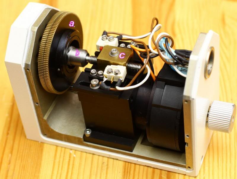Der Motor treibt ein Ritzel an, das in das große spielfreie Zahnrad (a) greift. Dieses wird einfach statt des Grobtriebknopfs auf die Hohlachse geschraubt und mit der Hutmutter (b) gesichert. Diese ist durch eine Spindel verlängert und diese verschiebt das Messingklötzchen (c), das über die Mikroschalter den Hub begrenzt. In den Motor geht vom Stecker ein ganzes Bandkabel - ich nehme an, es ist ein Schrittmotor.