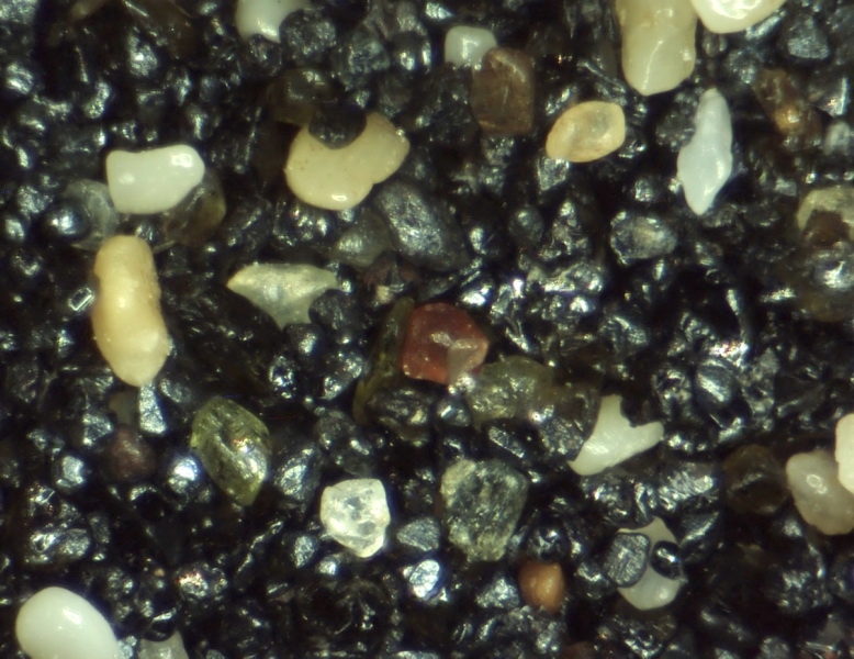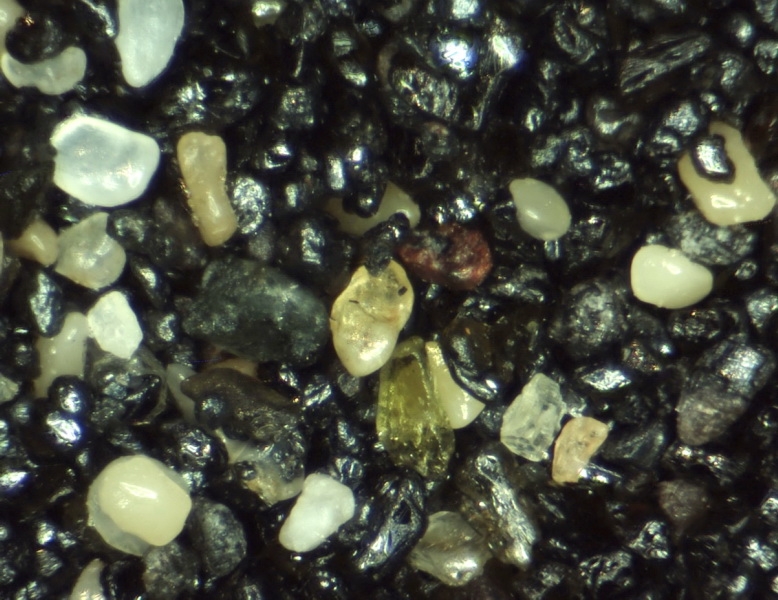 Am Maspalomas-Strand finden sich immer mal wieder Aufschwemmungen  von feinstem schwarzem Sand, der auch sehr schöne kleine Olivine enthält. Hier einmal zwei Bilder mit einer Bildbreite von ca. 2,5 mm: