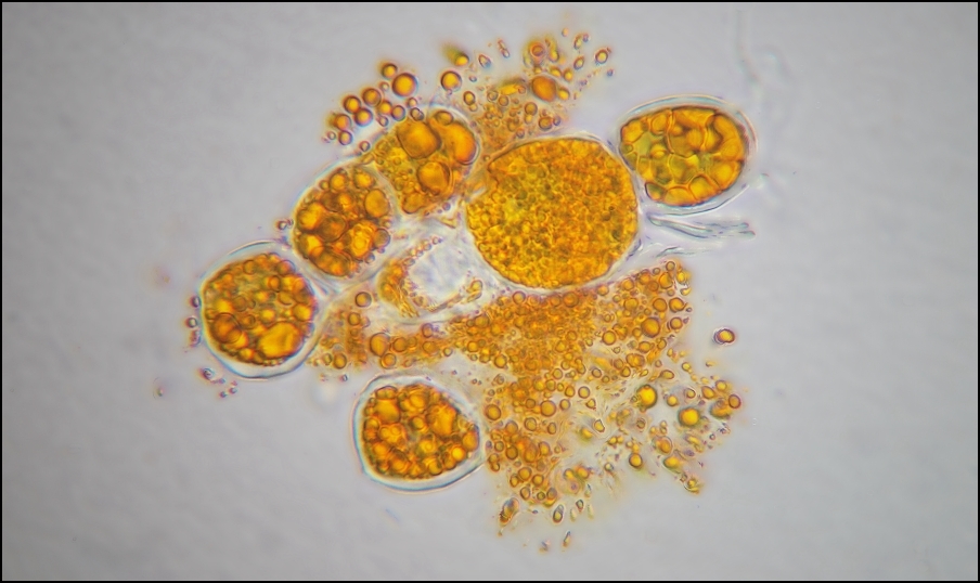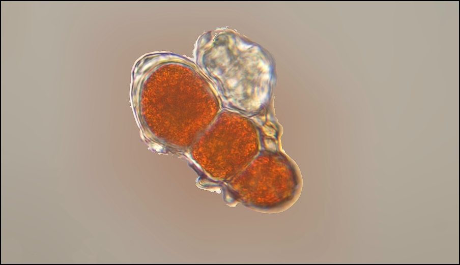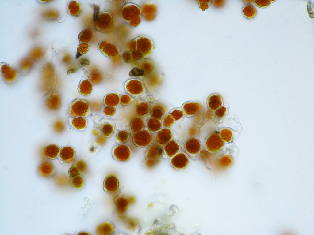 Dagegen sind auf allen Fotos von Euch, die ich für Porphyridium halte, die Zellen nie ellipsoid, sonsdern rundlich bis kantig und sehr unterschiedlich im Durchmesser.