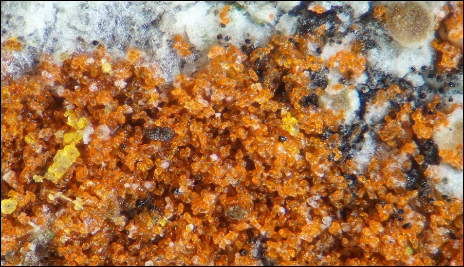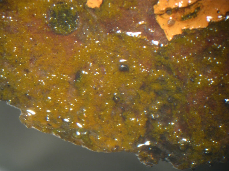 eine improvisierte Aufnahme eines Rindenstückchens mit Trentepohlia unter meiner Stereo-Lupe:
