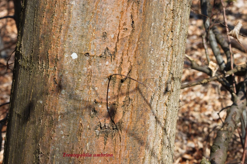 Trentepohlia umbrina, derzeit allgegenwärtig, laut Suchfunktion hier nur einmal gezeigt (was ich mir gar nicht vorstellen kann), auf Apfel-Borke und im Durchlicht mit dem 40er: