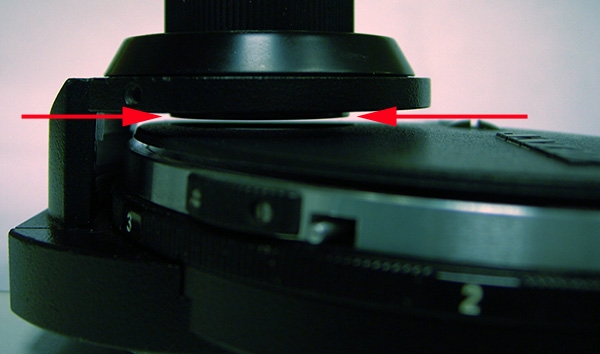 Zu Bild 2: auch bei meinem Kondensor ist der Abschluß nicht sonderlich dicht. Der Deckel scheint mir etwas verspannt zu sein, da der Spalt über die 360 Grad nicht gleichmäßig ist ( geschätzt 0,3-1mm) Allerdings besteht die Gefahr des Herausfallens des Stellringes bei umgekehrter Montage nicht.