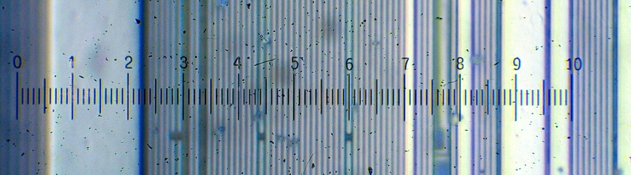 Beim Beobachten verwende ich aber ein Okularmikrometer. Auf dem Tisch neben dem Mikroskop klebt ein kleiner Zettel mit Werten Mikrometer pro Skalenteil.