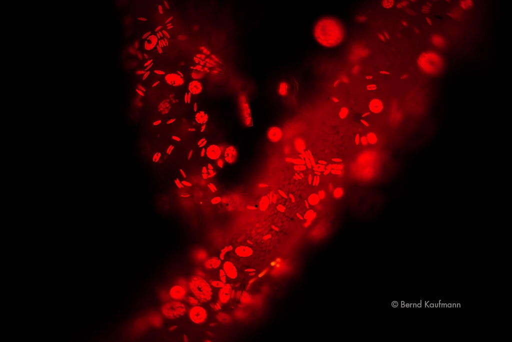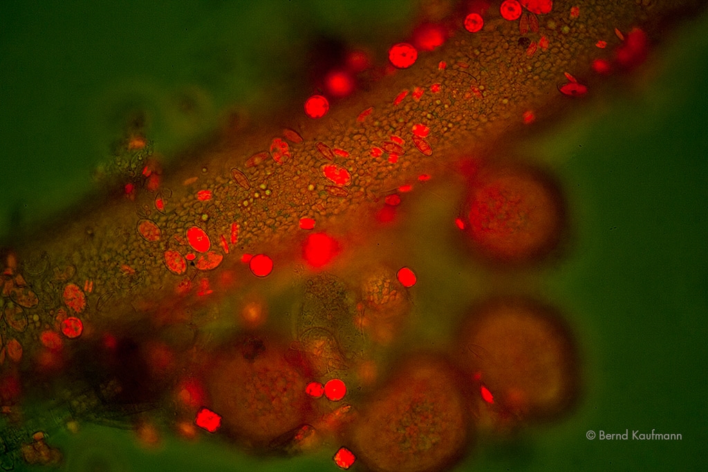 Zum Schluss noch zwei Aufnahmen in Auflicht-Fluorezenz, bei denen man auch scharf abgegrenzt die aufsitzenden Diatomeen sehen kann: