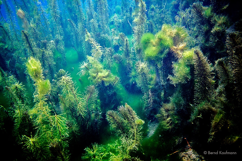Hier nun der Brenztopf mit seiner Unterwasserwelt: Die vorherrschende Pflanze ist Hippuris vulgaris, in der relativ seltenen rein submersen Form.
