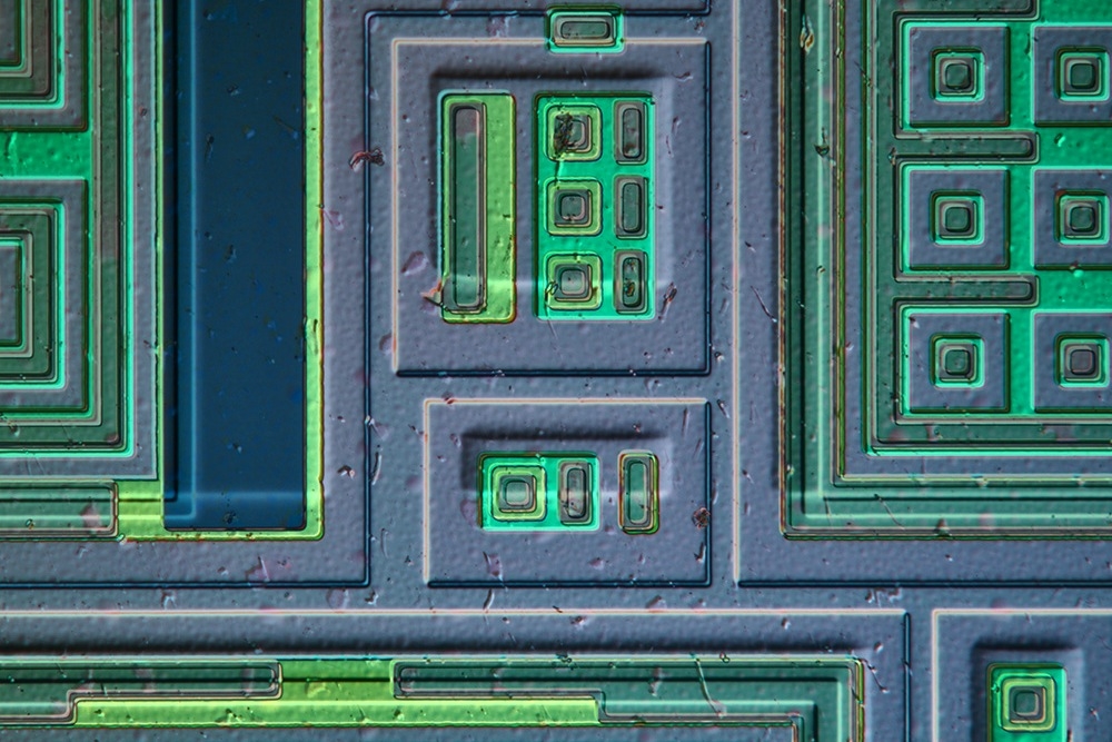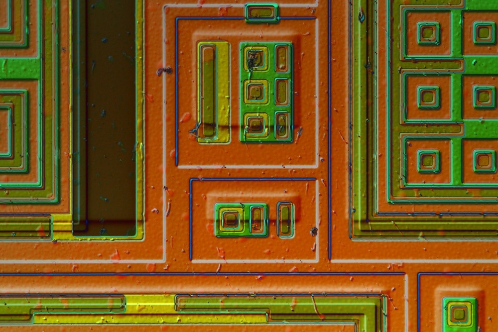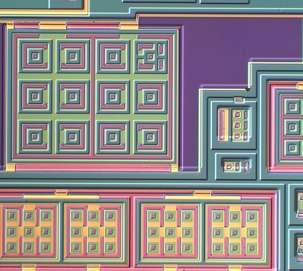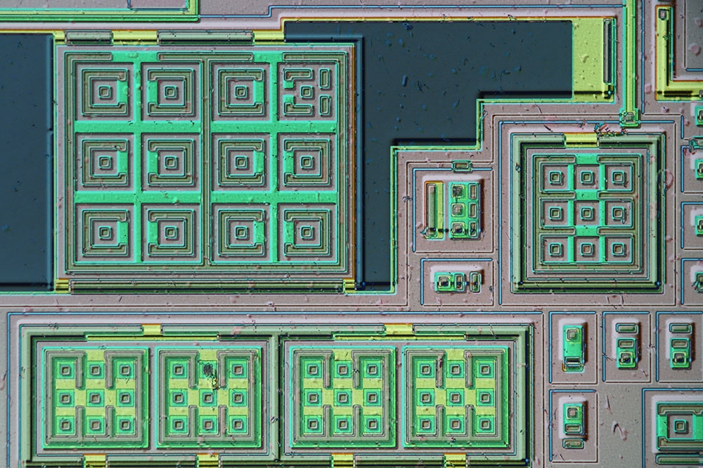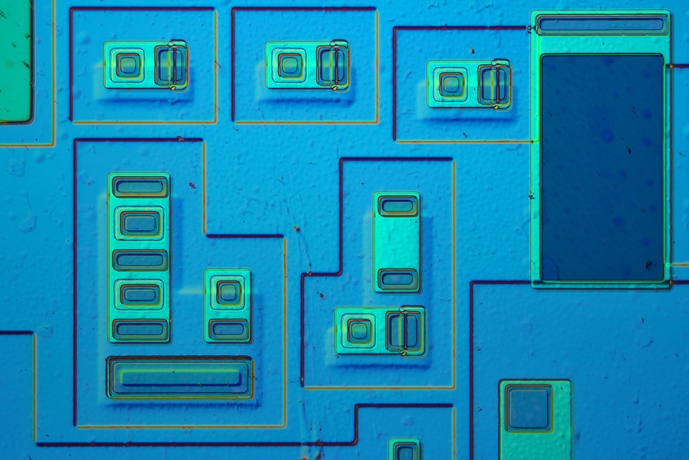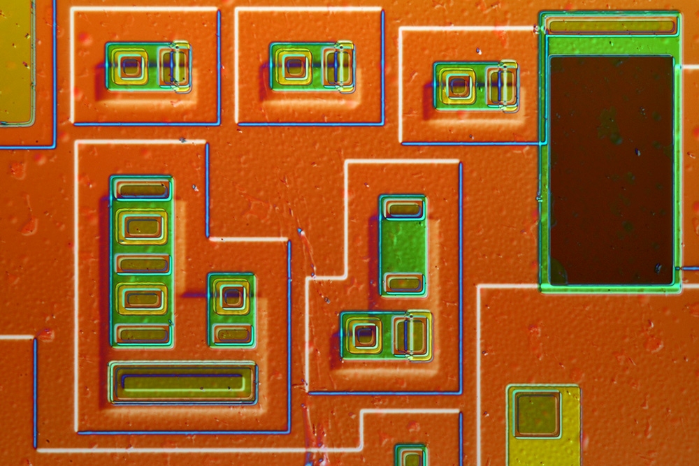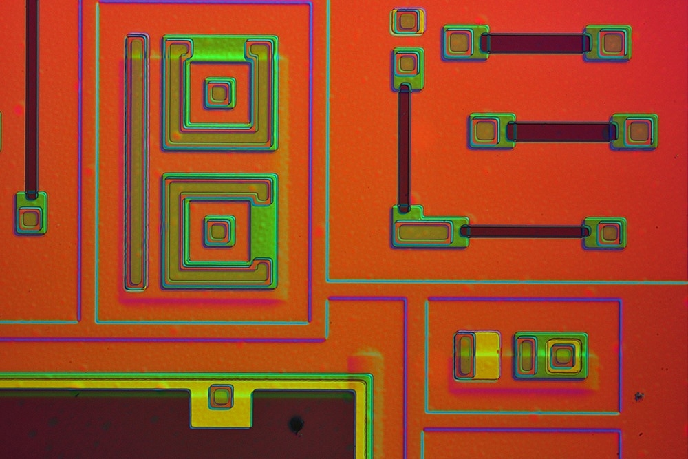 diese Waver müssen zu Tausenden verschrottet worden sein. Fast auf jedem Flohmarkt zu finden. Und wie es der Zufall will, habe ich vor einem Jahr auch solche Aufnahmen gemacht. Olympus BH2 mit UMA und einem Neo SPlan 10x mit DIC. Hier nur ein kleiner Ausschnitt. Selbst das uralte BH-2 bringt noch Bilder zustande.