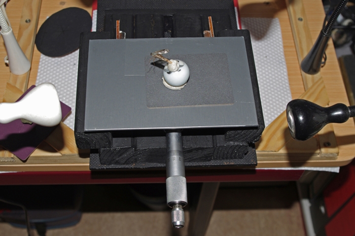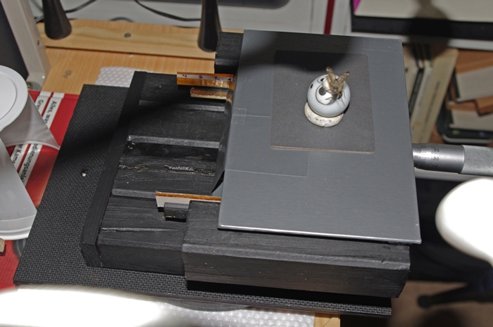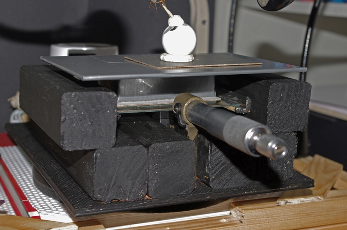 Das Herzstück ist eine einfache Bügelmessschraube, denen Anschlag abgesägt wurde. Das Ding wurde dann zwischen einer