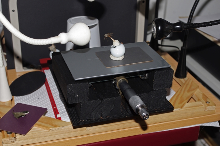 Als Tisch dient eine kleine Glasscheibe (etwa 10x13cm, aus mehreren Objektträgern zusammengeklebt), der auf zwei kleinen