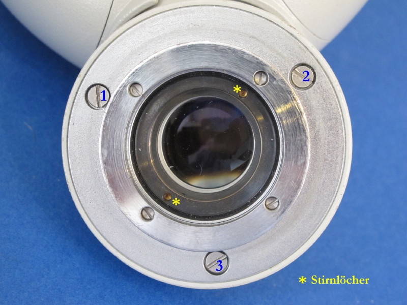 Ich hab mal Bilder gemacht, wie man überprüfen kann, ob die Einheit Objektiv und Umlenkprisma sauber ist. Dazu die Schrauben 1-3 lösen. Wichtig: formschlüssigen Schraubendreher verwenden, die sitzen fest! Wenn sie ganz raus sind, dann an der Ringschwalbe halten und von unten her rauskippen. Das ist wichtig, weil das Prisma oben hinterschneidet. Bei der Montage muss man dann auch erst oben "einfädeln" und danach unten absenken. Achtung: manchmal sind dünne Aluscheiben als Höhenausgleich untergelegt. Die müssen an der selben Stelle verbleiben!