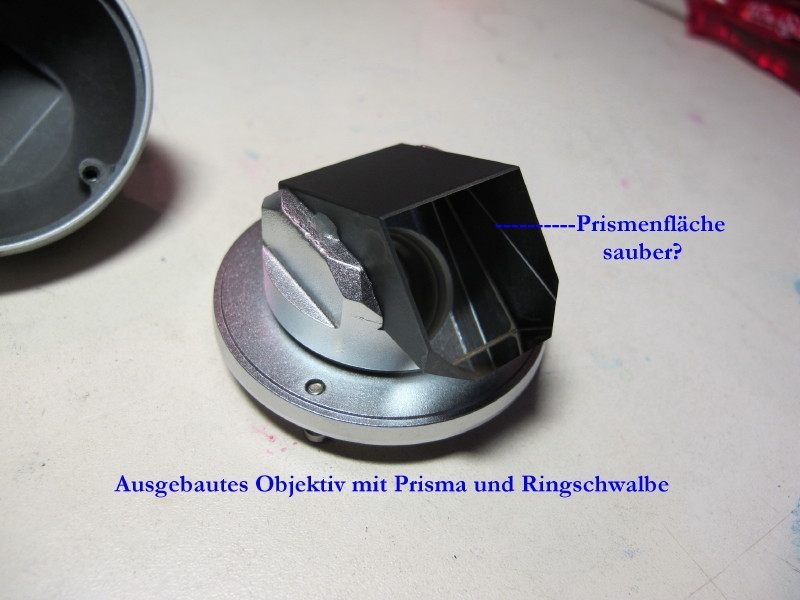 Oder umgekehrt: wird ein Defekt durch die Okular Tuben gesehen, liegt der Fehler im Objektiv-Prisma - ich hoffe ich habe das optische Bauteil korrekt benannt (es ist das Teil mit der LInse, dessen Ausbau so perfekt mit Bildern beschrieben wurde - nochmals vielen Dank an dieser Stelle für deine Mühe Klaus!!!!).