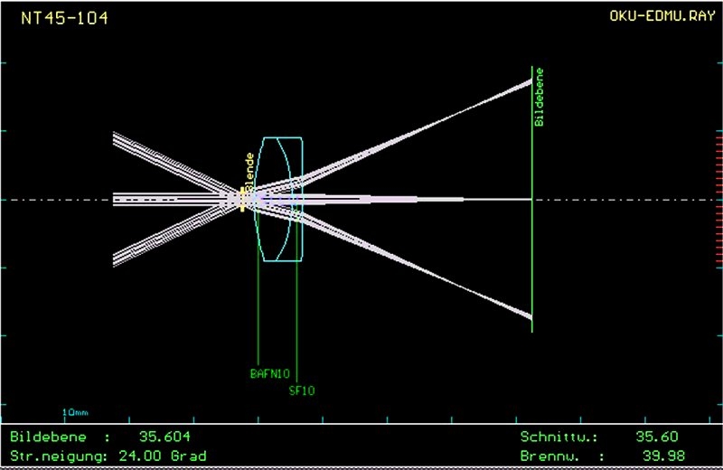 Beim Spotdiagramm mußte die Fenstergröße um den Faktor 2 vergrößert werden, so extrem zeigt sich der Fehler durch Bildfeldwölbung. Auch wenn die anderen Fehler noch erträgliche Größen zeigen, so stört doch die Wölbung sehr. Selbst in der Grafik für den Strahlenverlauf kann man die ungünstige Bildfeldwölbung erkennen.