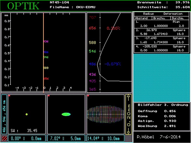 Allein durch diese Fehlerrechnung erkennt man, dass es einen bestimmten Abstand gibt, welcher einen besten Kompromiss aller Werte bedeutet. Das Spotdiagramm gibt dann noch über Form und Farbabweichung Auskunft. Gerade die CVD läßt sich gut abschätzen.