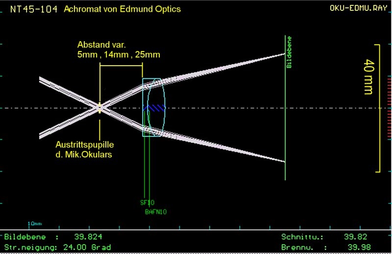 auf Deinen besonderen Wunsch und weil Pfingsten vor der Tür steht  ;D , habe ich mich durchgerungen und gerechnet. Es ist keine ganz graue Theorie, denn ich habe auch einen Achromatadapter im Einsatz. Von Edmund Optics gibt es eine große Auswahl an diversen Linsen, Achromate, usw. Hier mit einem kleinen Achromat mit f=40mm und 18mm Durchmesser. Da die Systemdaten bekannt sind kann gerechnet werden.
