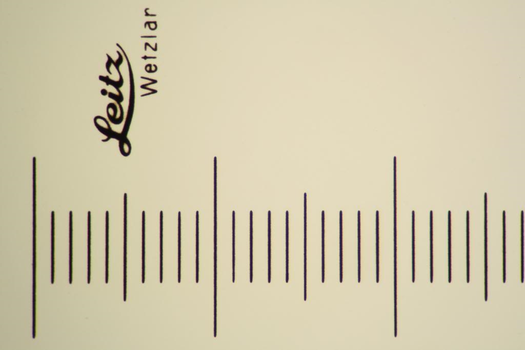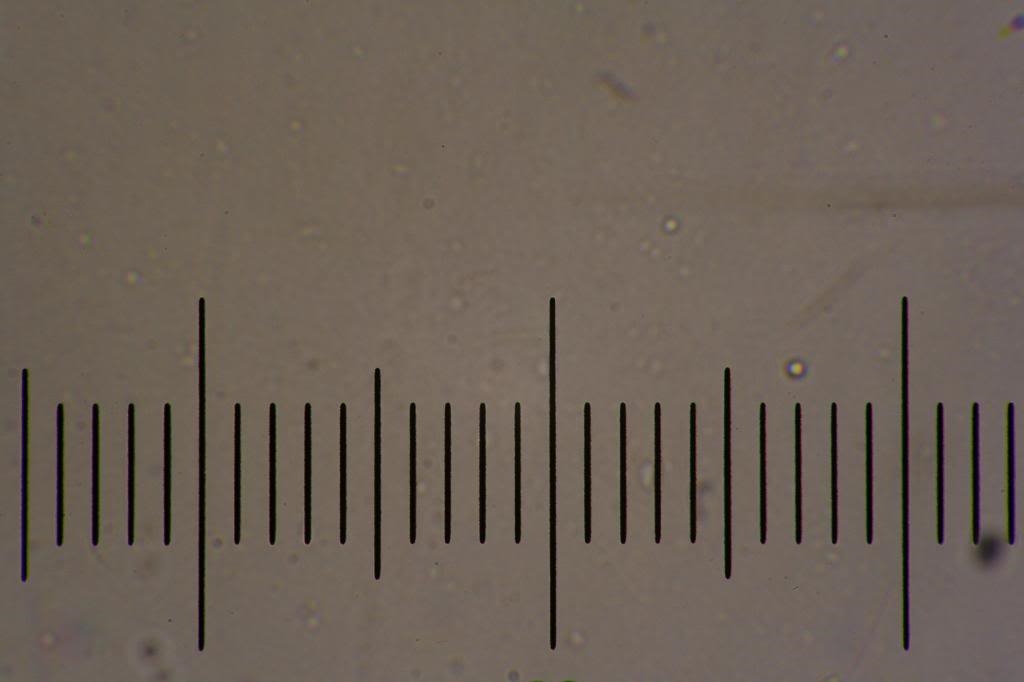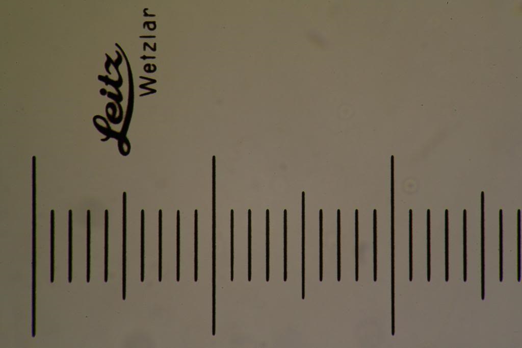 Als Beleuchtung diente ein LED. Das Objektmikrometer ist ein altes von Leitz, mit einem sehr dicken Deckglas über der Skalierung.