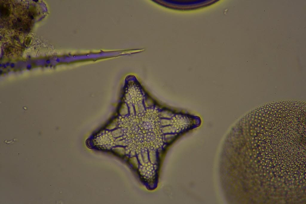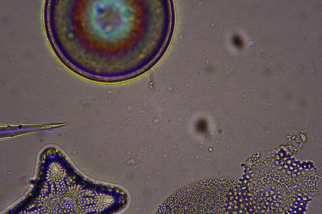 Das, was an Störungen bei den beiden unteren Bildern zu sehen ist, befindet sich fast alles auf der Linse des Kondensors. Durch ein Dezentrieren des Kondensors verändern diese Störungen die Position.