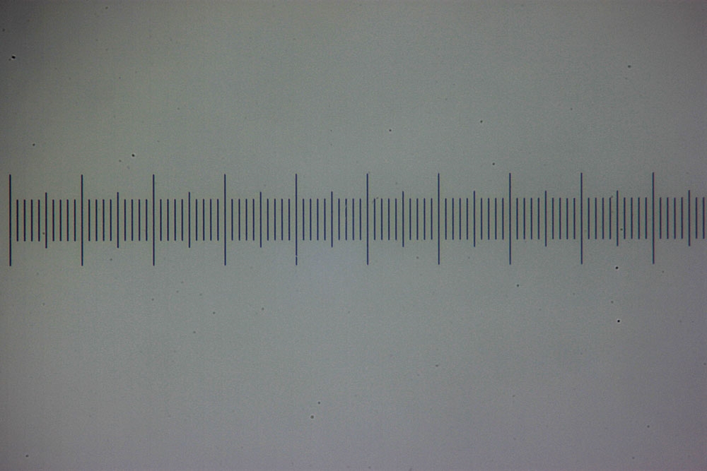 Aber warum geht das bei mir nur so grau und flau? Das ist offenbar ein ganz anderes Problem. Ich sollte doch so ein Objektmikrometer einfach in Schwarz-Weiss (wie im Beobachtungstubus) und nicht Grau-in-Grau abbilden können. Mache ich da was bei der Kameraeinstellung (EOS 500D) falsch?