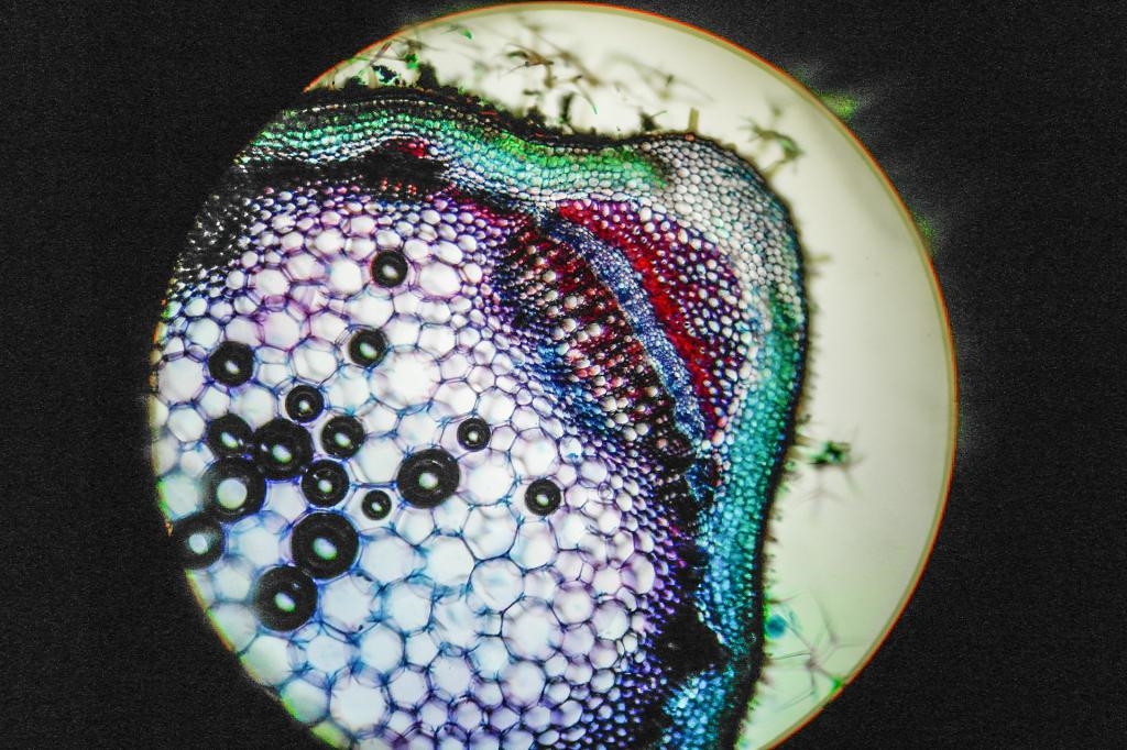 Auf dem Objektträger habe ich einen kleine Menge Glyceringelantine vorsichtig mit einem Föhn erwärmt, bis es gerade flüssig geworden ist. Dann habe aus dem Pinsel möglichst viel Alkohol mit einem Lappen heraus gesaugt und den  Pflanzenquerschnitt auf die erwärmte Glyceringelantine gelegt. Nachdem ich das Deckgläschen aufgelegt hatte, habe ich es mit einer M8 Mutter beschwert abkühlen lassen. Hier das Ergebnis, aufgenommen mit einer Handykamera hinter dem Okular:
