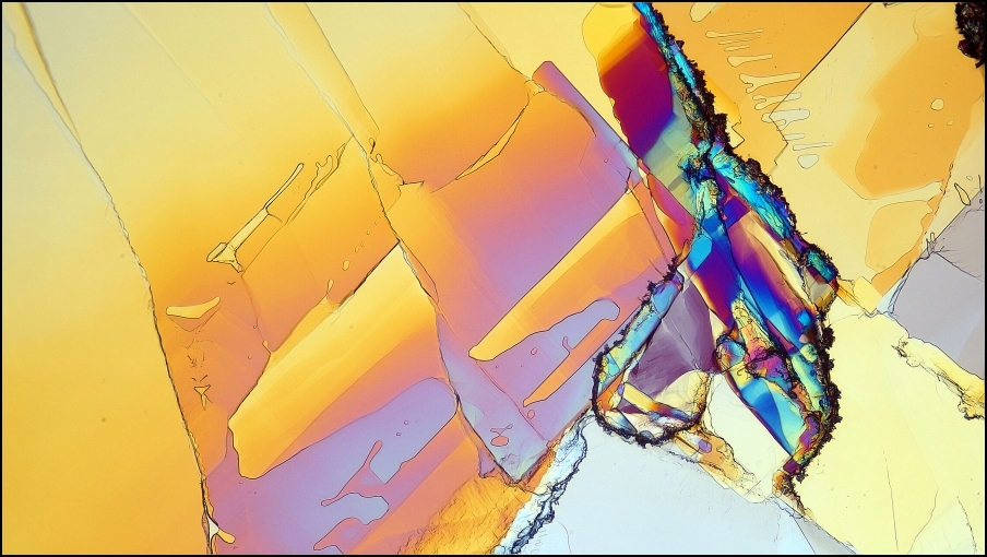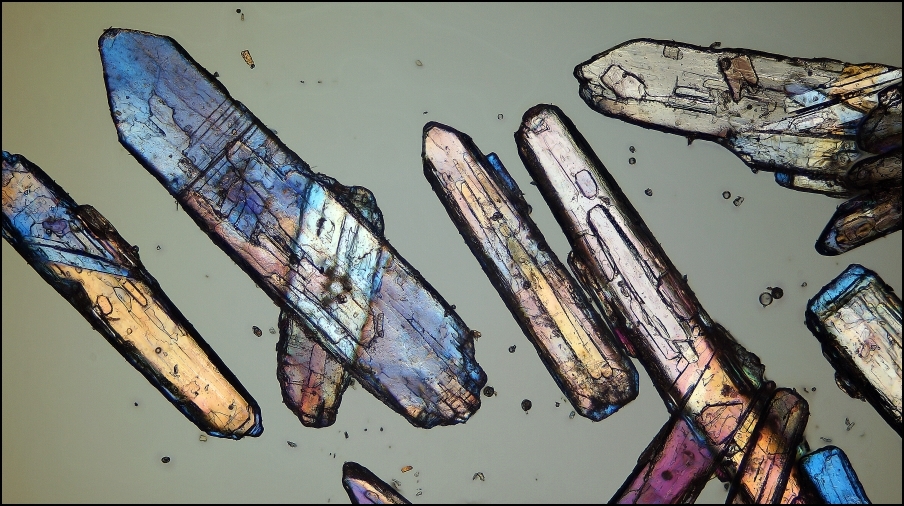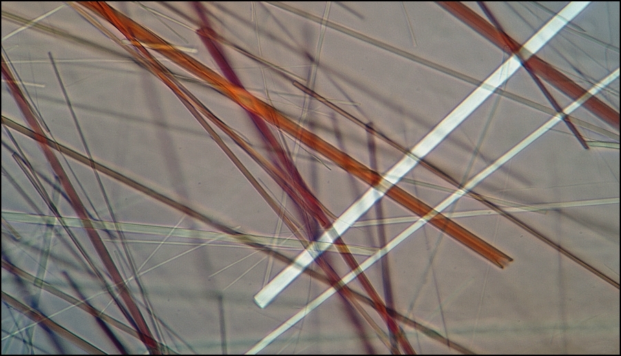 ... war nicht zu bewegen, aus der Lösung (Wasser, Aceton, Ethanol) ansehnliche Kristalle zu bilden. Wenn nach etlichen Tagen die übersättigte Lösung trübe wird, also kristallisiert, findet man lediglich diese winzigen Nadeln: