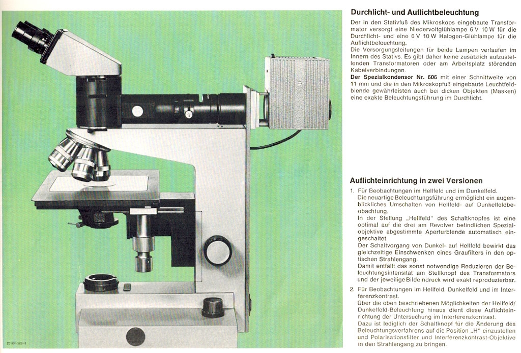 Die DF-Objektive wurden mit den kleineren grauen Stativen (Dialux, SM-Lux, HM-Lux) eingeführt. Es gab dazu einen passenden Auflicht-Illuminator für Hell- und Dunkelfeld.