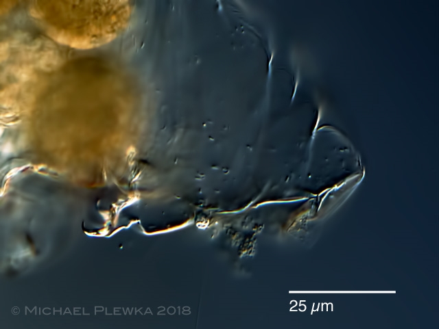 Deine Frage ist natürlich so sehr naheliegend, dass sie mir auch schon in den Sinn gekommen war, als ich die Exuvie beobachtet habe. Also hatte ich nach einer entsprechenden Öffnung gesucht. Da ich davon ausgehe (ich lasse mich auch gerne eines besseren belehren), dass, wenn die Eier (nach) hinten abgelegt werden, folglich die Hülle vorne verlassen wird, habe ich insbesondere den Vorderteil gründlich ,,unter die Lupe genommen. Aber egal welche Focusebene ich auch eingestellt habe: eine Öffnung fand ich nicht. Das hier gezeigte Bild des Vorderteils ist natürlich (wegen der geringen Schärfentiefe) kein Beweis für die Nichtexistenz einer solchen Öffnung, zeigt aber eine Detritusflocke, welche sich beim Bewegen der Exuvie (festgestellt beim Hinzufügen von frischem Wasser) nicht ablöste. Vielleicht ein kleiner Hinweis darauf, das die Öffnung nach dem Verlassen vom Muttertier  ,,zugeklebt" wurde?