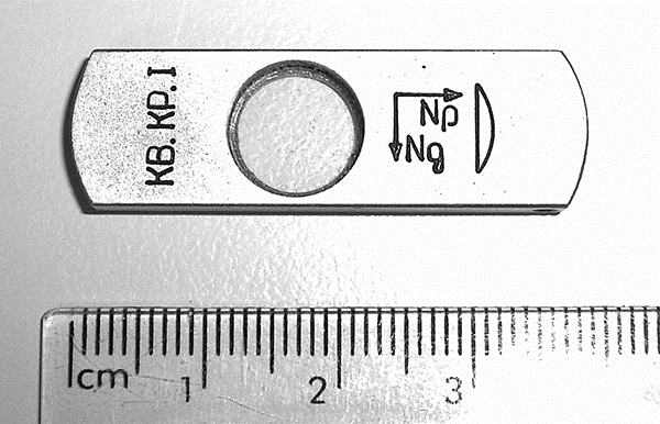 das ist ganz sicher ein Kompensator (wahrscheinlich Rot I); die beiden rechtwinklig aufeinander stehenden Pfeile bezeichnen die Schwingungsrichtungen, die in Frankreich und Russland traditionell mit ng (n grand) und np (n petit) gekennzeichnet werden. Der Kompensatorschlitz in dem passenden MIkroskop muss diagonal NE-SW verlaufen.