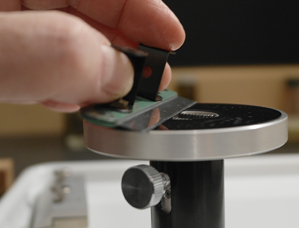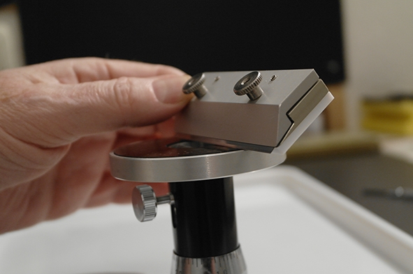 Ich helfe mir, in dem ich den Probenhalter während des Schnittes an der Klemmschraube unten halte. Da die auftretenden Kräfte allerdings nicht sehr groß sind, reicht oft auch ein aufgelegter Pinsel, der dann auch das Einrollen der Schnitte verhindert oder zumindest minimiert.