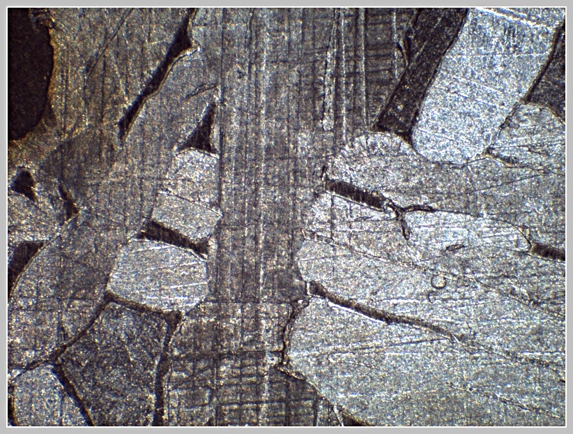 Das interessante daran sind die gebogenen Widmanstättenschen Strukturen, die sich beim Aufprall deformiert haben.