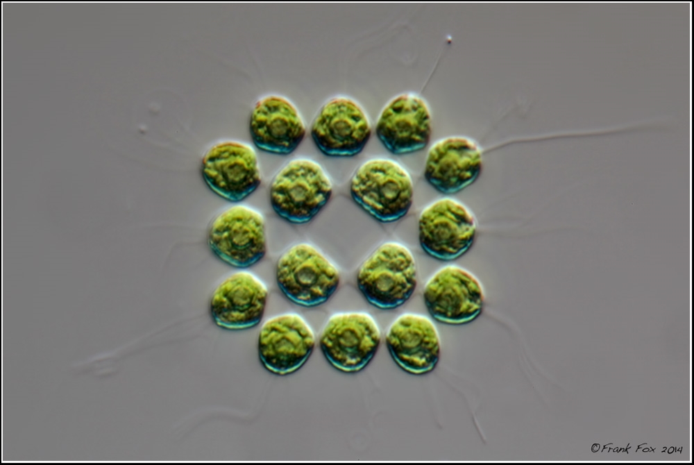 Laut "Kosmos-Algenführer" bestehen diese Algen meist aus 16 Zellen, die sich in einer becherartig gebogenen Ebene anordnen.