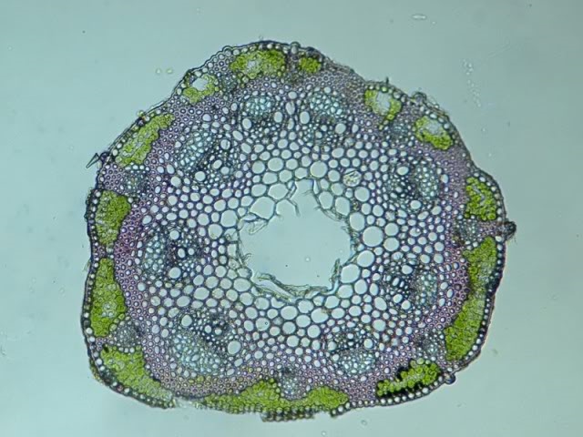 ich bekam kürzlich ein kleines (von einem älteren Herrn selbst angefertigtes) Handschnittgerät geschenkt und wollte es natürlich einweihen. Meine Wahl fiel auf einen Grashalm, Glatthafer (Arrhenátherum elátius). Die kleinen Schnittchen legte ich in eine rote Brühe aus aufgeweichtem Kopierstift. Fand davon auch einige wieder, die kamen in dest. Wasser und danach auf den Objektträger, auch in dest. Wasser. Es waren tatsächlich diesmal keine Luftblasen vorhanden und ich fotografierte die zart angefärbten Schnittchen: