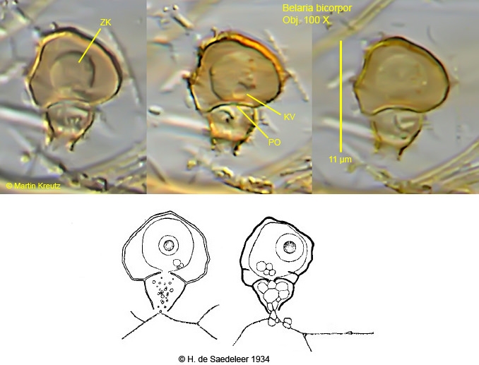Erst im Jahre 2006 habe ich mir den Tümpel nochmal vorgenommen und versucht, etwas in der dicken Gallerte zu finden. Dazu ist eine etwas eigenwillige Probenpräparation nötig, die ich hier im Forum auch schon gezeigt habe (https://www.mikroskopie-forum.de/index.php?topic=18799.msg143504#msg143504). Erst in der gequetschten und ausgebreiteten Gallerte fand ich dann zahlreiche, sehr kleine Vertreter der Schalenamöben wie Microgromia, Cryptodifflugia oder Apogromia. Diese Gruppen von Testaceen wurden 1934 von de Saedeleer eingehend untersucht. Dabei hat er auch eine Art beschrieben, die ich lange vergeblich gesucht habe. Es handelt sich um Belaria bicorpor, einer doppelt gekammerten Schalenamöbe. Ich hatte dieses Jahr das Glück, sie auch mal zu Gesicht zu bekommen. Die folgenden Aufnahmen zeigen das einzige gefundene Exemplar. Die rechte Aufnahme wurde im Hellfeld aufgenommen. Darunter habe ich die Originalzeichnungen von de Saedeleer einkopiert: