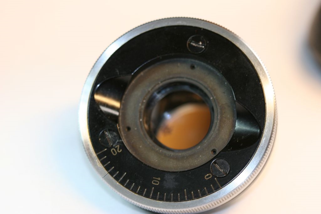Nachdem ich diese gänzlich aus dem Stativ entfernt und geöffnet hatte, war der Schaden gut sichtbar. Da ich zumeist erst ab dem 16er-Objektiv ordentlich ,,geköhlert" hatte, fiel er mir bei Orientierungsblicken durch´s 2,5-er bzw. 10-er Objektiv offensichtlich bislang nicht auf.