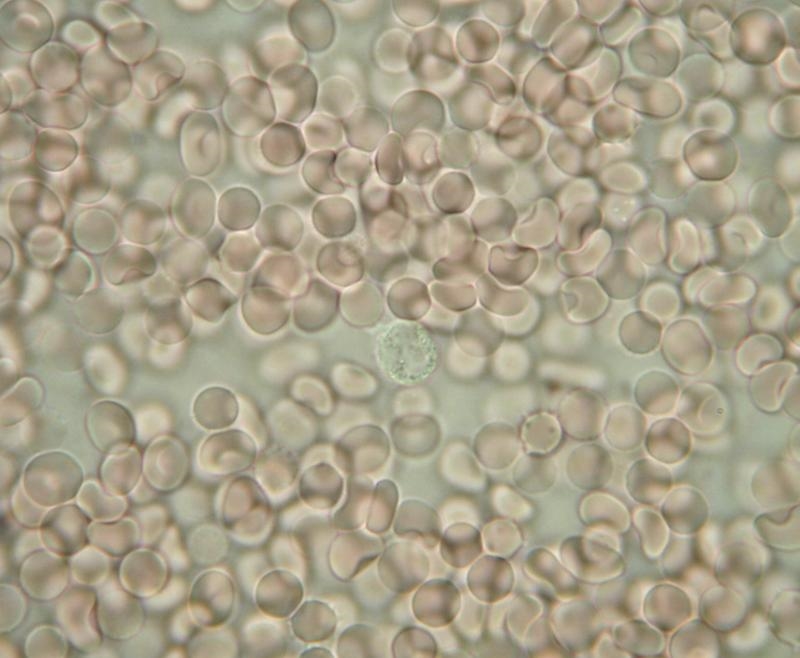 Aufname gemacht mit Achromat 100. Im Mittel ist eine Leukozyt zu sehen. Auch zu sehen sind die typische Formen der Erythrozyten (bikonkav).