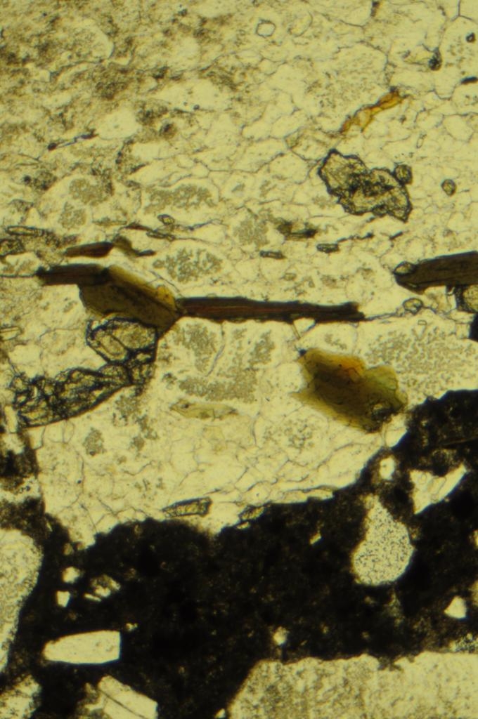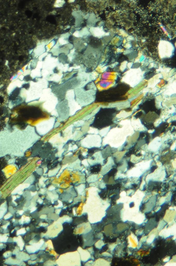 Bei der Abbildung handelt es sich um einen Dünnschliff von Beton. Das Gesteinskorn in der Zementmatrix ist ein Gneis. Das längliche Mineral in der Mitte der Bilder dürfte ein Biotit sein, wenn ich mich nicht täusche (bräunlich Farbe, starker Pleochroismus, vollkommene Spaltbarkeit, tafelig, grünliche Interferenzfarbe, Auslöschung unter XPL bei 0 und 90° zu den Spaltflächen ).