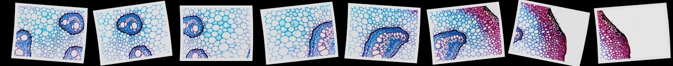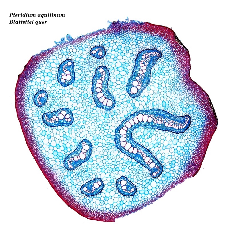 Hier ein Blattstielquerschnitt von Pteridium aquilinum, gefärbt mit Astrablau/Safranin, zusammengesetzt aus 190 Teilbildern.