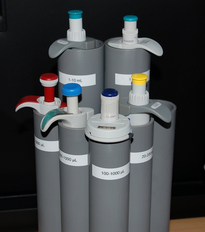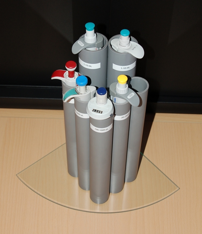 Weil ich mehrere Sorten habe wie z.B. Eppendorf Research, Eppendorf Reference, Finnpipette und ich kein Riesensumme ausgeben möchte für ein Ständer habe ich selber was gebastelt und es gefällt prima. Einfach einige PVC-Rohren mit die richtigen innen Abmessungen, eine Glasplatte und was Epoxyd Kleber.