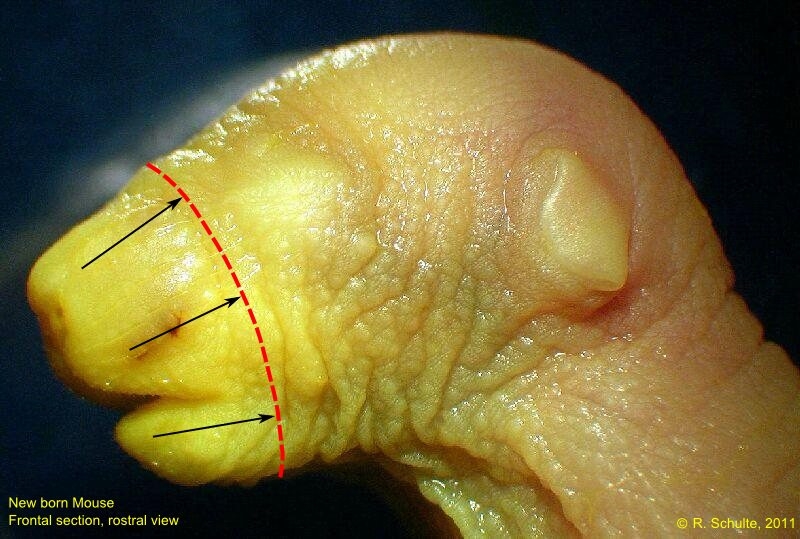 Der Nasebereich liegt oben in die Mitte. Die Zunge ist schön zu sehen, ebenfalls die Zwei Zahnglocken im Unterkiefer.