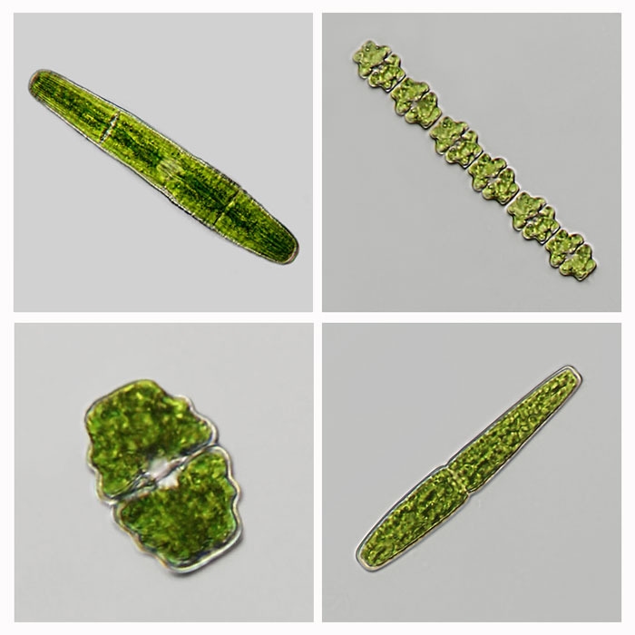 Nr. 1: Penium spirostriolatum, Nr. 2: Spondylosium cf. pulchellum, Nr. 3: Cosmarium venustum, Nr. 4: Pleurotaenium minutum