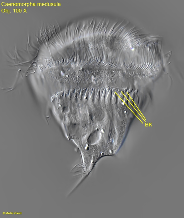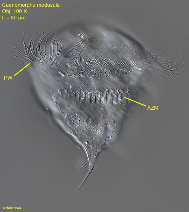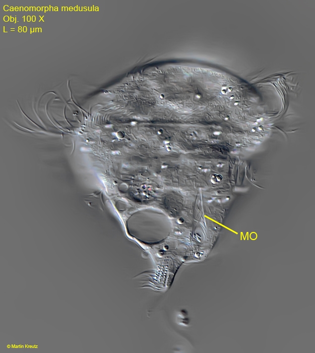 Hier ein Kandidat der Kl. 1. Es handelt sich um den recht kompliziert geformten Ciliaten Caenomorpha medusula. Ein typischer Bewohner des Faulschlammes. Er ist ca. 80 µm lang und schwimmt recht flott. Die Schwierigkeit beim fotografieren ist den hinten liegenden Dorn und den schirmförmigen Körper in einer Fokusebene abzulichten: