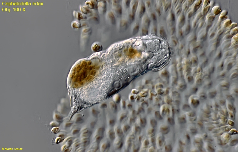 Die Zuordnung habe ich selbst nicht geschafft, sondern brauchte die Hilfe von Christian Jersabek von der Uni Salzburg. Die Art C. edax wurde erst 1993 durch Hollowday erstmalig beschrieben (http://link.springer.com/article/10.1007/BF00025871#page-1). Daher hatte ich sie in meinem Bestimmungswerk von Voigt nicht gefunden. Es ist mir allerdings ein Rätsel, warum die Art erst so spät beschrieben wurde. Immerhin lebt sie offen im Plankton. Findet man eine befallene Kolonie von Uroglena volvox, so erkennt man diese sofort. Das Rädertier ist ca. 120 µm lang und ernährt sich offensichtlich durch das ,,abpflücken" von Uroglena Zellen von innen heraus. Später legt Cephalodella ein Ei in der Kolnie ab und verlässt diese dann. Ich möchte in diesem Zusammenhang auf die homepage von Michael Plewka verweisen, der das Glück hatte, dass abgelegte Ei in der Kolonie zu fotografieren (http://www.plingfactory.de/Science/Atlas/KennkartenTiere/Rotifers/source/Cephalodella%20edax.html).