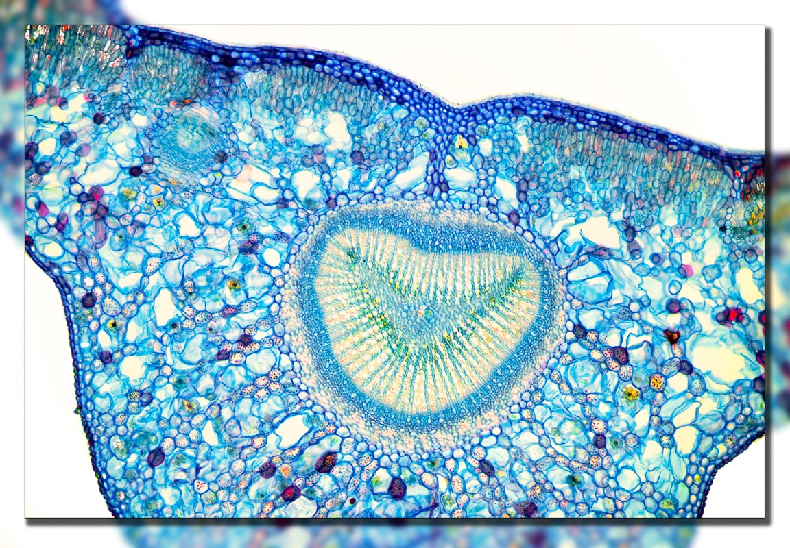 An der Stelle, wo der Stängel in das Blatt übergeht, habe ich eine andere Färbemethode zur Kontrastverstärkung angewandt  (Etzold Blau)