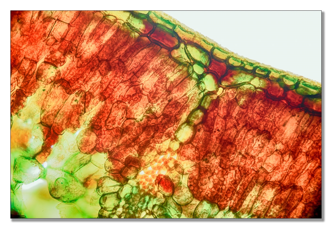 Geht man noch näher heran, sieht man schon die Schichtstruktur des Blattes  (die dunkelblaue Schicht ist die Blattoberseite)