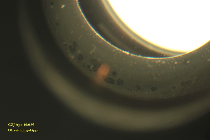 schon etwas seltsam diese Blasen. Auf deinem ersten Bild kann man sie am Rand sehen. Auf meinem ersten Bild sind sie von 12-6:00 Uhr als diffuse "Perlenreihe" ganz am Rand zu sehen. Offensichtlich leidet darunter die Qualität nicht. In meinem "gekippten" Bild sieht man sie deutlich. Hab ne Weile probiert, bis ich sie so sichtbar gemacht habe. Der gelbrote Spot ist ein Reflex vom Stemiobjektiv.